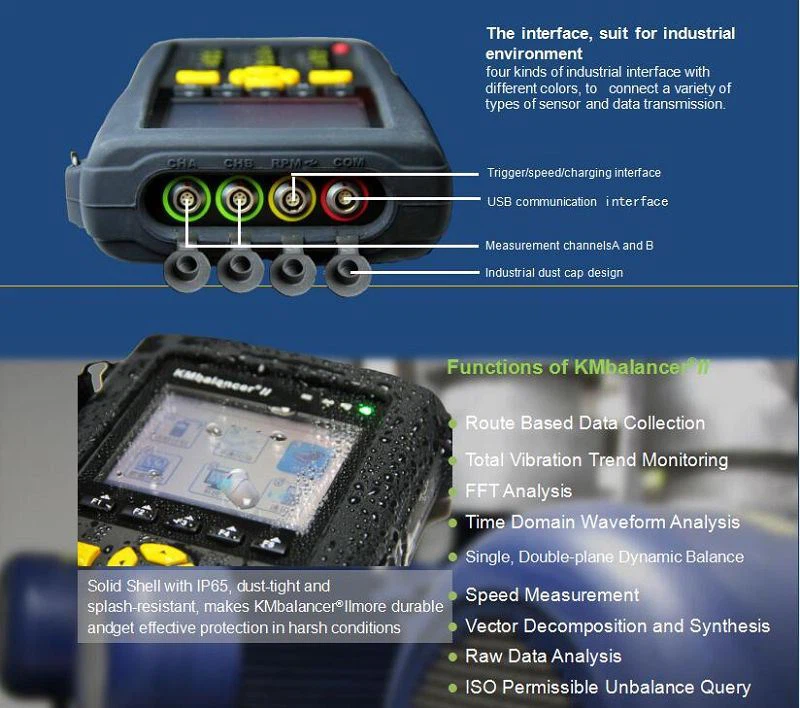 KMbalancer®II es fácil y práctico de operar. La mayoría del analizador de vibraciones de alto orden tiene un problema que la función de análisis de medición se establece demasiado engorrosa, lo que no es adecuado para la detección de mantenimiento y mejorar los problemas en la fábrica. KMbalancerIIcan®analiza todo tipo de problemas de vibración, como desequilibrio, desalineación, flexión del eje, pérdida de equipos, turbulencia de fluidos, lubricación deficiente, condición anormal del motor, rodamientos y engranajes, etc.