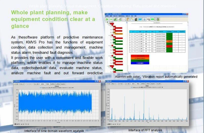KMbalancer®II son adecuados para todo tipo de máquinas rotativas, como motor, bomba, compresor de aire, molino de viento, caja de engranajes, turbinas de vapor, generadores, torres de refrigeración, etc. Con el potente software kmVS Pro Data Collection and Analysis, podemos gestionar la base de datos del equipo, monitorizar la tendencia de estado, analizar la causa anormal y emitir el informe, etc. Su análisis de espectro y análisis de forma de onda de tiempo se pueden utilizar como base del monitoreo de condición. En términos generales, para el personal de mantenimiento de equipos, la condición del rodamiento de los equipos giratorios es el problema más preocupante, KMbalancer®II tiene una potente capacidad de procesamiento de datos con un procesador de microcontrolador integrado de alto rendimiento a 400 MHz. Con la base de datos de fallas de rodamientos incorporada, KMVS Pro se puede utilizar para analizar los primeros problemas anormales de los rodamientos.